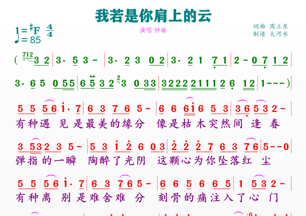 《我若是你肩上的云》是钟瑜演唱的一首歌曲,拍号为4/4拍,歌曲速度为每分钟85拍,这份简谱共有一张高清图谱,图谱由 @临海雪原 编配上传。