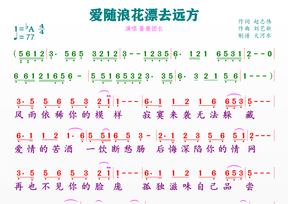 《爱随浪花漂去远方》是蔷薇团长演唱的一首歌曲,拍号为4/4拍,歌曲速度为每分钟77拍,这份简谱共有一张高清图谱,图谱由 @临海雪原 编配上传。