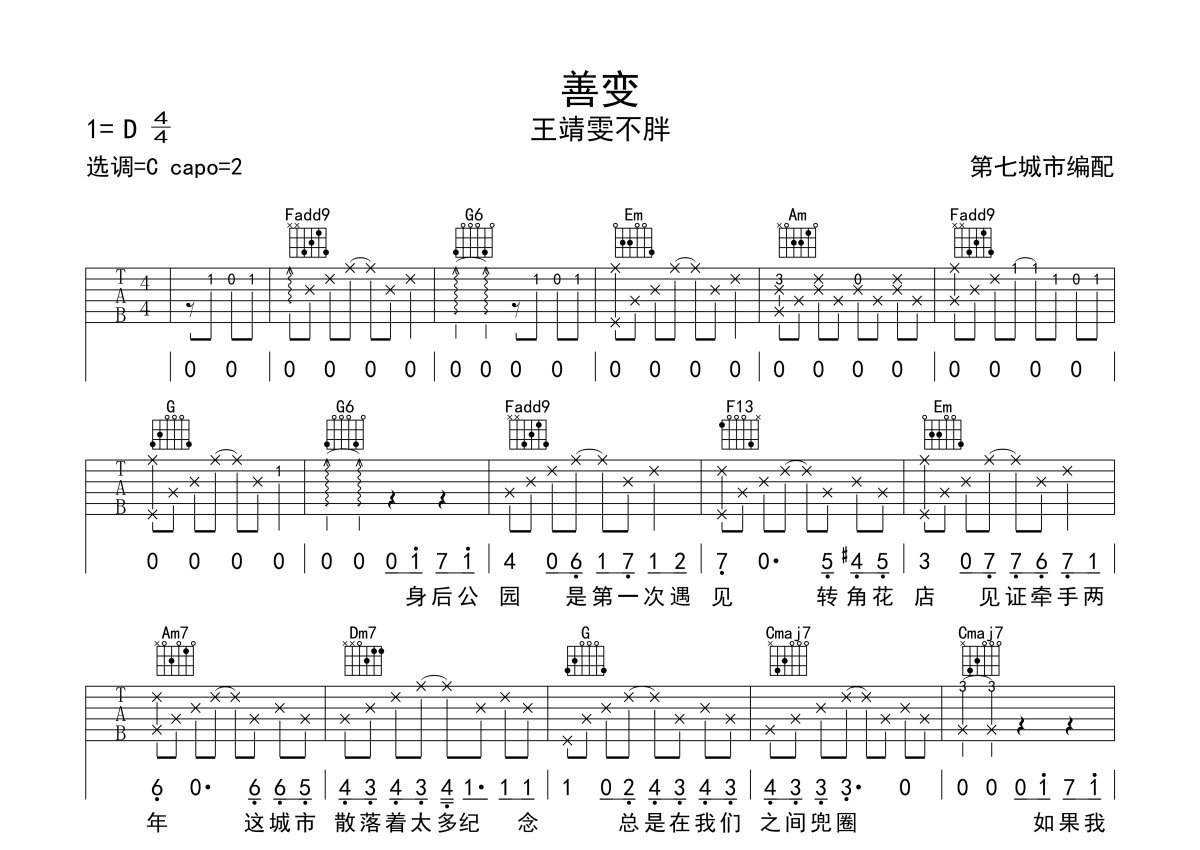 《善变》是王靖雯不胖演唱的一首歌曲,本吉他谱采用的是C调指法编配,这份吉他谱共有两张高清图谱,图谱由 @第七城市 编配上传,图谱使用六线谱编配,包含吉他和弦指法、简谱以及歌词部分,使用这份善变吉他谱,可以让你更加方便地掌握这首歌曲的弹唱技巧,快来尝试吧。王靖雯不胖《善变》吉他谱_C调吉他弹唱谱。