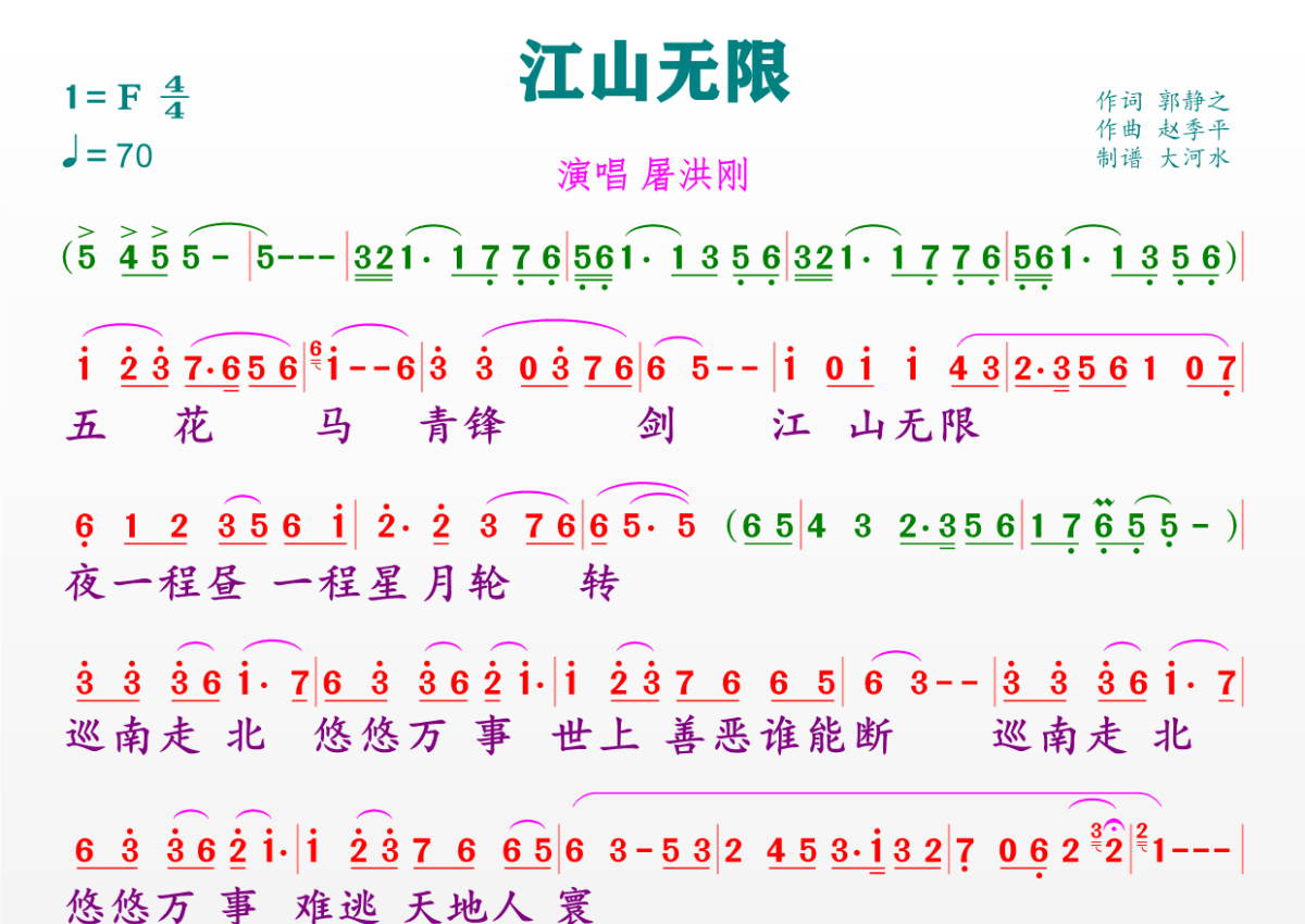 《江山无限》是屠洪刚演唱的一首歌曲,拍号为4/4拍,歌曲速度为每分钟70拍,这份简谱共有一张高清图谱,图谱由 @临海雪原 编配上传。