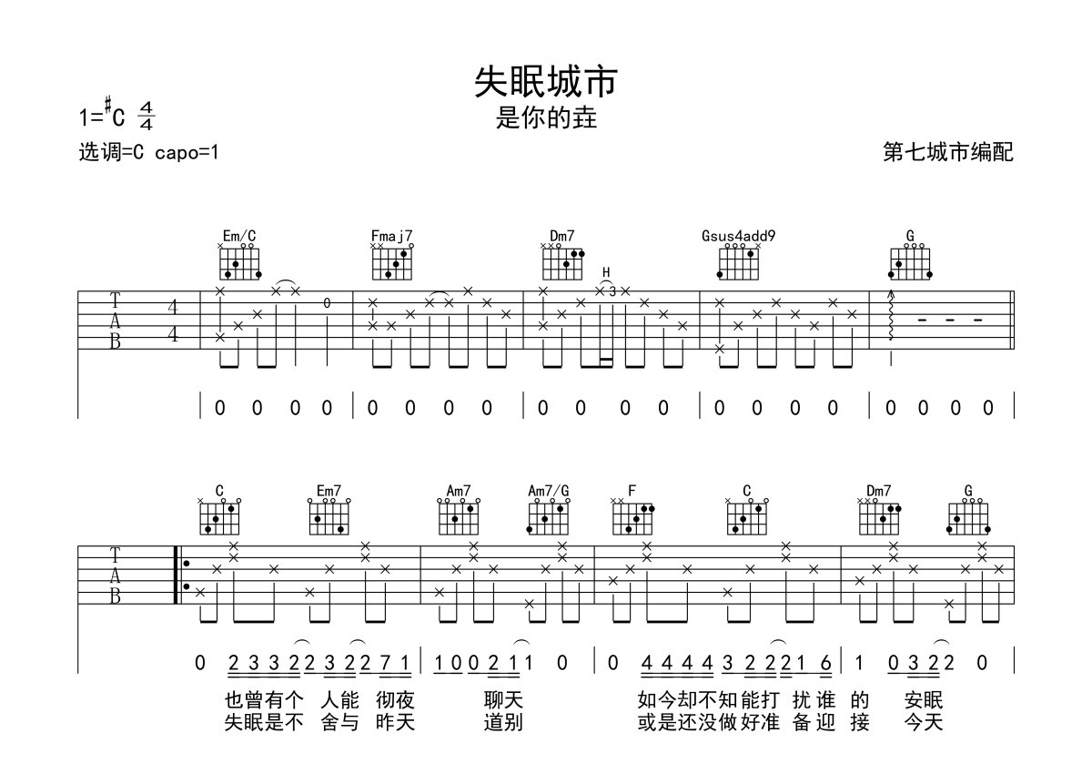 是你的垚《失眠城市》吉他谱 - C调弹唱六线谱