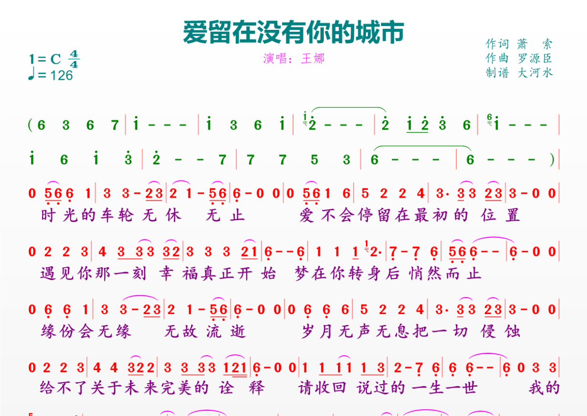 《爱留在没有你的城市》是王娜演唱的一首歌曲,拍号为4/4拍,歌曲速度为每分钟126拍,这份简谱共有一张高清图谱,图谱由 @临海雪原 编配上传。