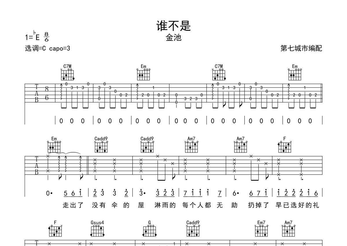 《谁不是》是金池演唱的一首歌曲,本吉他谱采用的是C调指法编配,这份吉他谱共有两张高清图谱,图谱由 @第七城市 编配上传,图谱使用六线谱编配,包含吉他和弦指法、简谱以及歌词部分,使用这份谁不是吉他谱,可以让你更加方便地掌握这首歌曲的弹唱技巧,快来尝试吧。金池《谁不是》吉他谱_C调吉他弹唱谱。