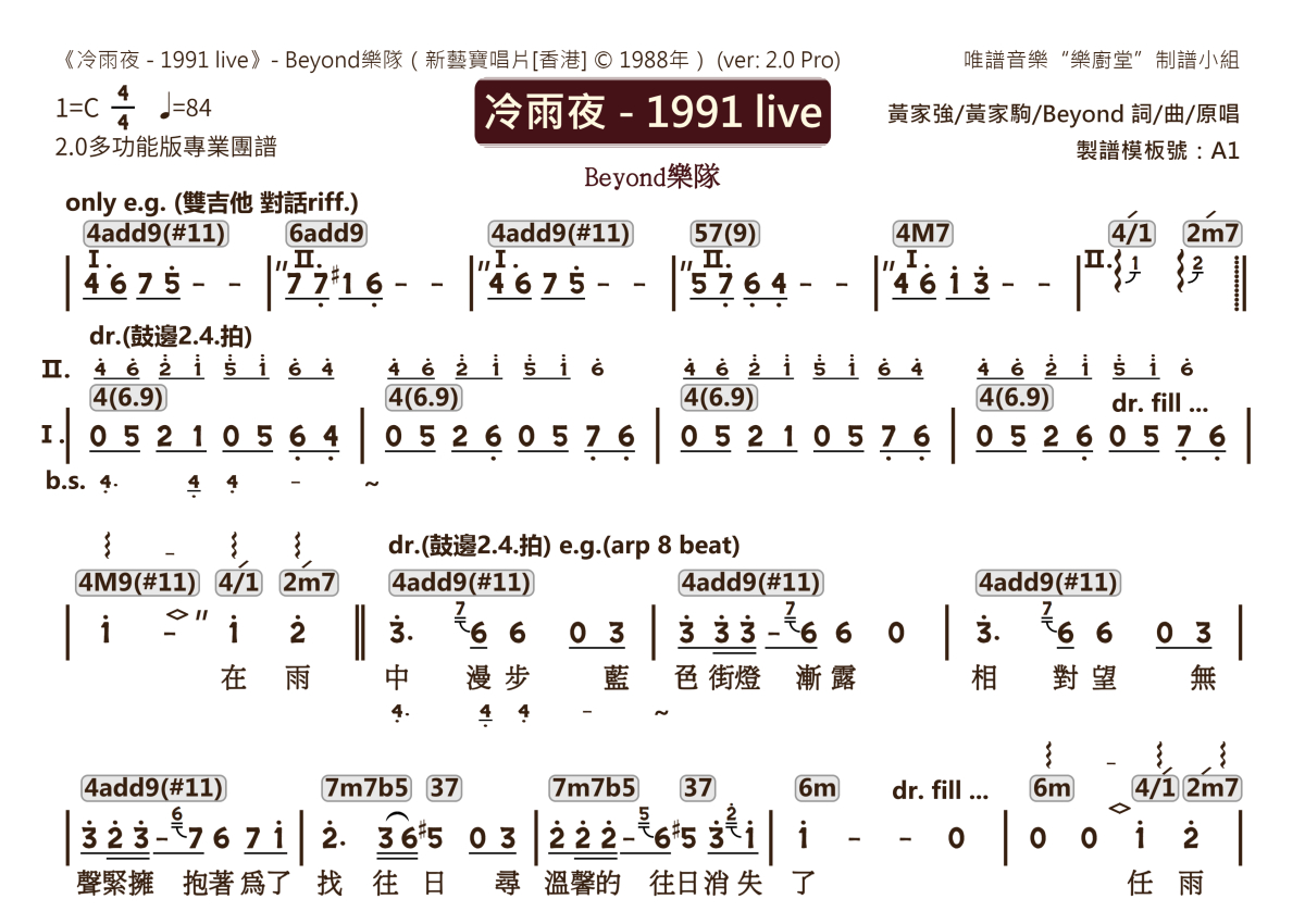 Beyond《冷雨夜》乐队总谱 - 2.0版多功能团谱