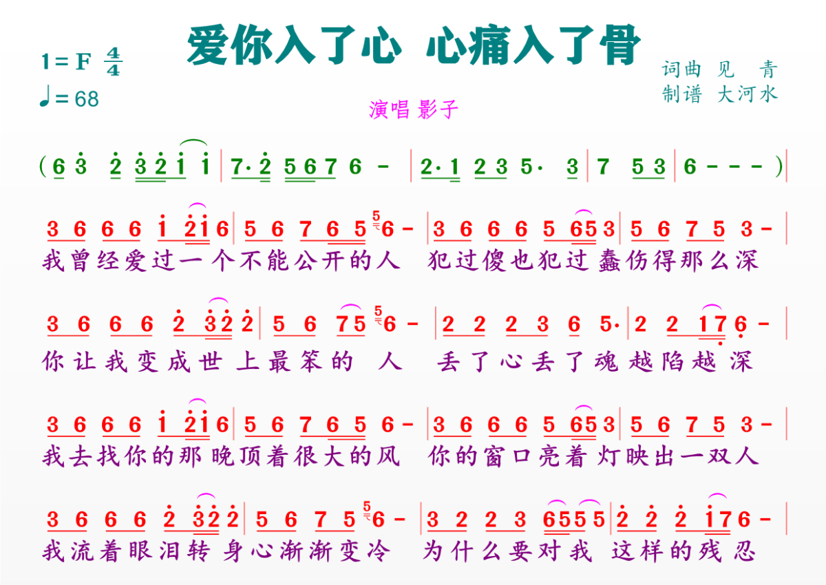 《爱你入了心心痛入了骨》是影子演唱的一首歌曲,拍号为4/4拍,歌曲速度为每分钟68拍,这份简谱共有一张高清图谱,图谱由 @临海雪原 编配上传。