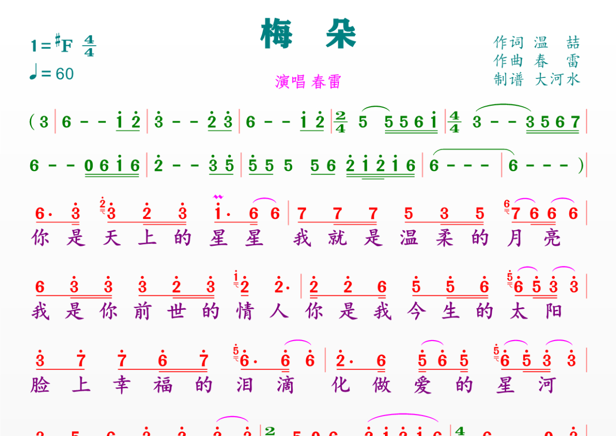《梅朵》是春雷演唱的一首歌曲,拍号为4/4拍,歌曲速度为每分钟60拍,这份简谱共有一张高清图谱,图谱由 @临海雪原 编配上传。