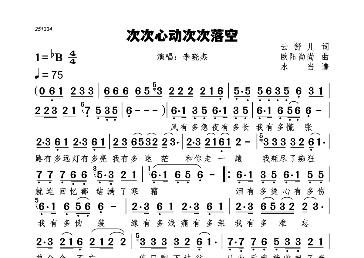 《次次心动次次落空》是李晓杰演唱的一首歌曲,拍号为4/4拍,歌曲速度为每分钟75拍,这份简谱共有一张高清图谱,图谱由 @水当 编配上传。