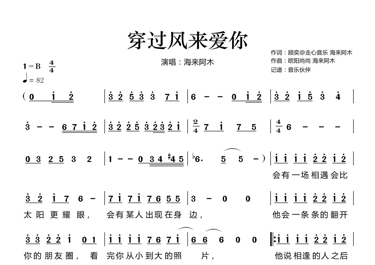 《穿过风来爱你》是海来阿木演唱的一首歌曲,拍号为4/4拍,歌曲速度为每分钟82拍,这份简谱共有两张高清图谱,图谱由 @音乐伙伴 编配上传。
