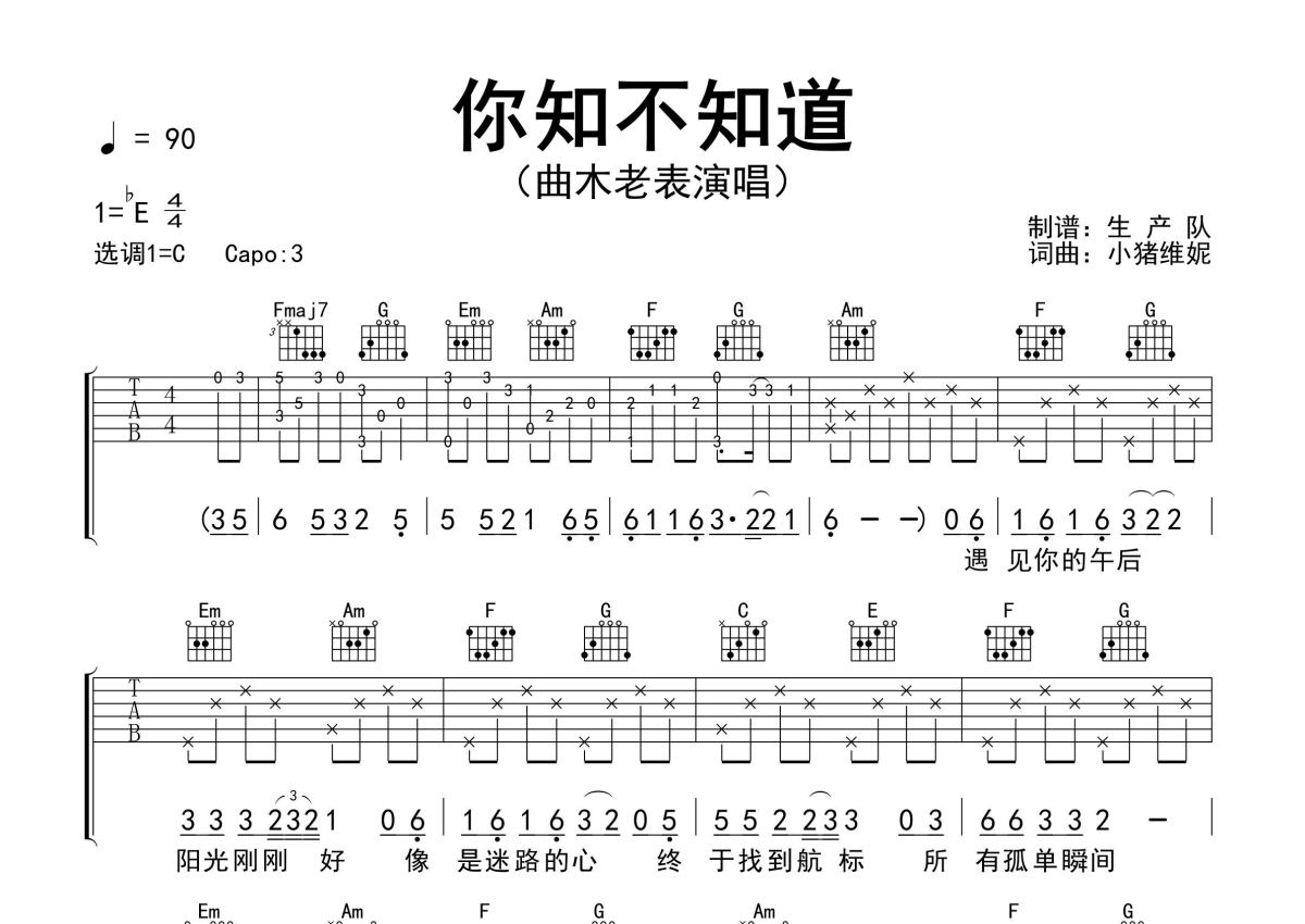 《你知不知道》是曲木老表演唱的一首歌曲,精编完美版,拍号为4/4拍,歌曲速度为每分钟90拍,歌曲原调为Eb调,但由于原调指法比较难,为了方便弹奏,本吉他谱采用的是C调指法编配,变调夹3品弹奏即为原调,当然也可以根据自己的音域改变变调夹位置,或者通过改变和弦调性,以方便自己弹奏,这份吉他谱共有两张高清图谱,图谱由 @生产队 编配上传,图谱使用六线谱编配,包含吉他和弦指法、简谱以及歌词部分,使用这份你知不知道吉他谱,可以让你更加方便地掌握这首歌曲的弹唱技巧,快来尝试吧。曲木老表演唱的歌曲《你知不知道》原版吉他谱,含精准的前奏、间奏solo编配,精编完美版,优质推荐!。