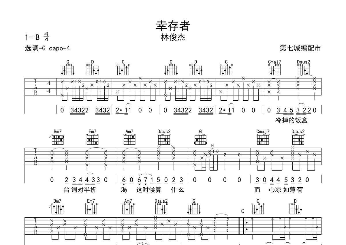 林俊杰《幸存者》吉他谱 - G调弹唱六线谱