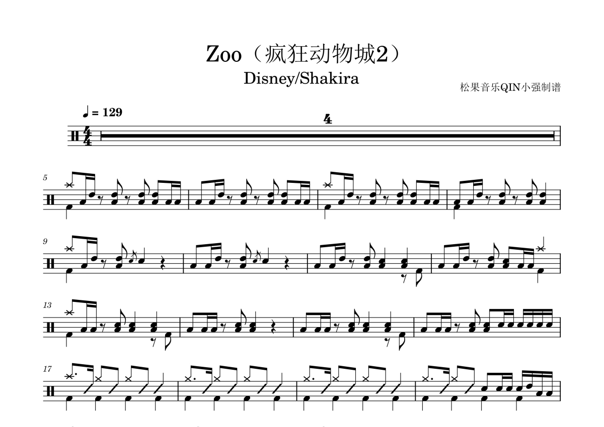 《Zoo(疯狂动物城2)》是疯狂动物城2演唱的一首歌曲,拍号为4/4拍,这份架子鼓谱共有三张高清图谱,图谱由 @松果音乐QIN小强 编配上传,图谱使用五线谱编配,使用这份Zoo(疯狂动物城2)架子鼓谱,你将能够轻松地敲打出这首疯狂动物城2的Zoo(疯狂动物城2),快来尝试吧。《Zoo》是夏奇拉为迪士尼动画电影《疯狂动物城2》创作并演唱的主题曲,由夏奇拉、艾德·希兰与布雷克·斯莱金共同完成词曲创作,于2025年10月10日在新西兰首发。该曲延续其代表作《Waka Waka》及前作《Try Everything》的励志风格,融合非洲节奏(Afrobeat)与拉丁元素,通过活力鼓点与多元编曲展现动物城文化特色。