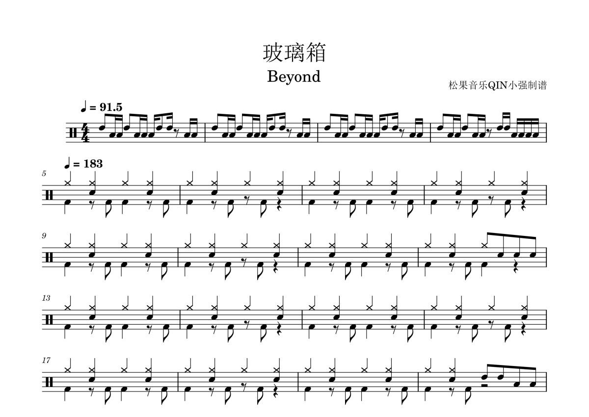 《玻璃箱》是Beyond演唱的一首歌曲,拍号为4/4拍,这份架子鼓谱共有五张高清图谱,图谱由 @松果音乐QIN小强 编配上传,图谱使用五线谱编配,使用这份玻璃箱架子鼓谱,你将能够轻松地敲打出这首Beyond的玻璃箱,快来尝试吧。《玻璃箱》是中国香港摇滚乐队Beyond于1987年发行的粤语歌曲,收录于专辑《亚拉伯跳舞女郎》,由主唱黄家驹创作词曲。