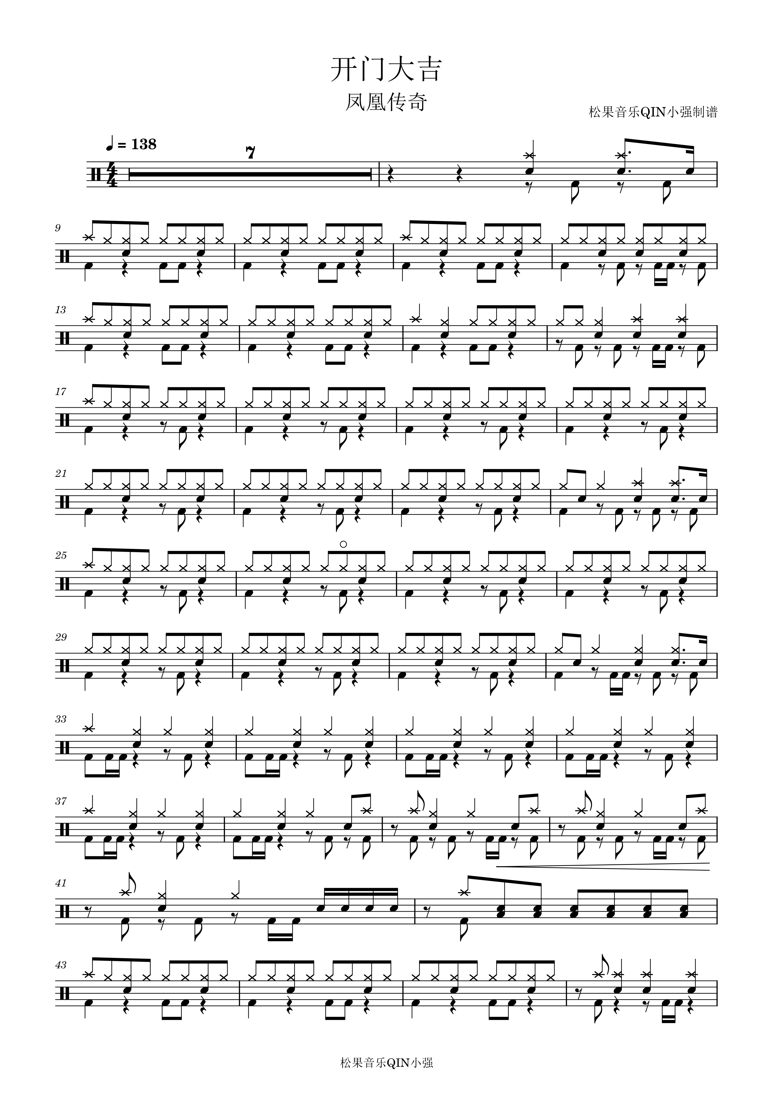 《开门大吉》是凤凰传奇演唱的一首歌曲,拍号为4/4拍,这份架子鼓谱共有三张高清图谱,图谱由 @松果音乐QIN小强 编配上传,图谱使用五线谱编配,使用这份开门大吉架子鼓谱,你将能够轻松地敲打出这首凤凰传奇的开门大吉,快来尝试吧。《开门大吉》是中央电视台综艺频道益智游戏类节目《开门大吉》的同名主题曲,由于瑞洋作词作曲,凤凰传奇演唱,2013年1月24日随节目首播正式发行。