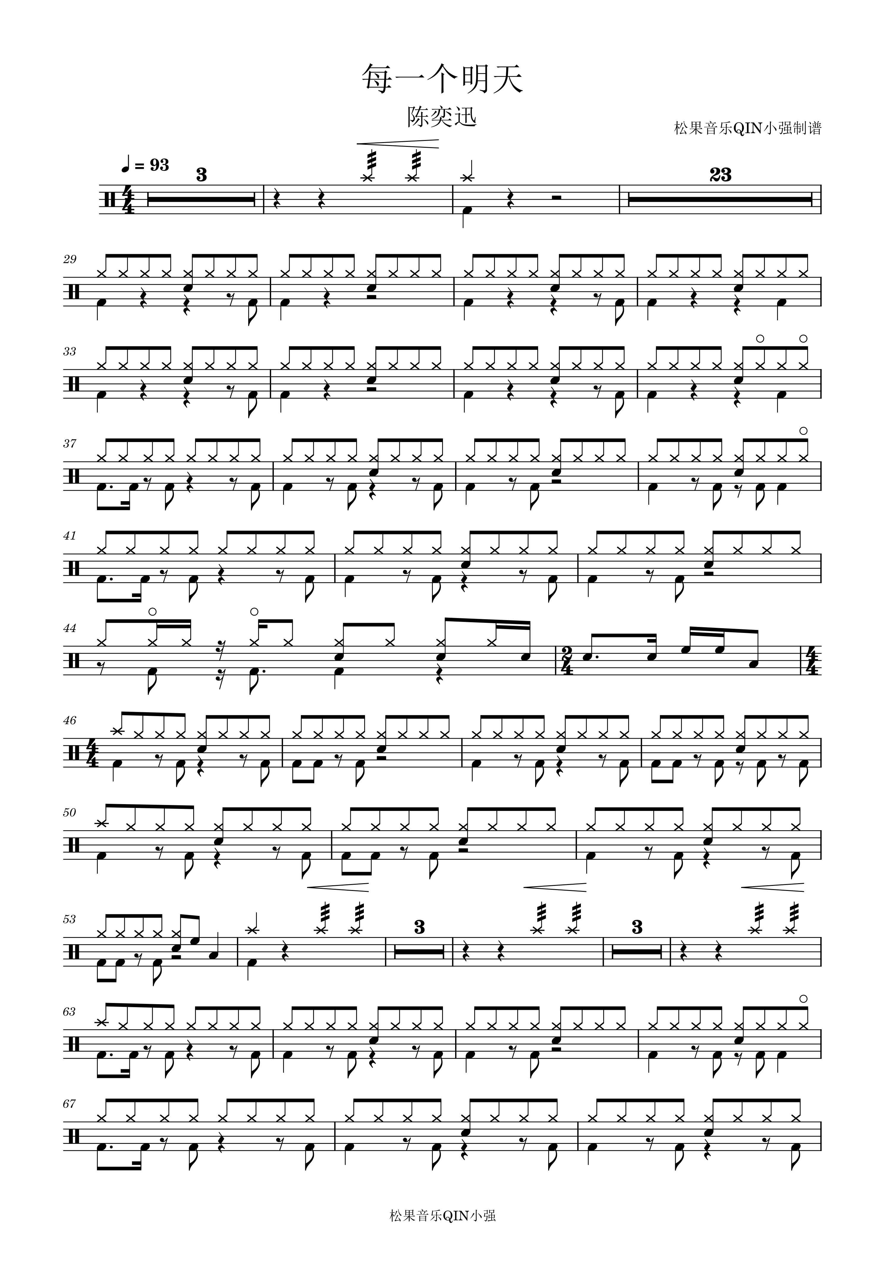 《每一个明天》是陈奕迅演唱的一首歌曲,拍号为4/4拍,这份架子鼓谱共有两张高清图谱,图谱由 @松果音乐QIN小强 编配上传,图谱使用五线谱编配,使用这份每一个明天架子鼓谱,你将能够轻松地敲打出这首陈奕迅的每一个明天,快来尝试吧。《每一个明天》是由林振强作词、柳重言作曲的粤语歌曲,收录于陈奕迅1999年5月26日发行的专辑《天佑爱人》中。