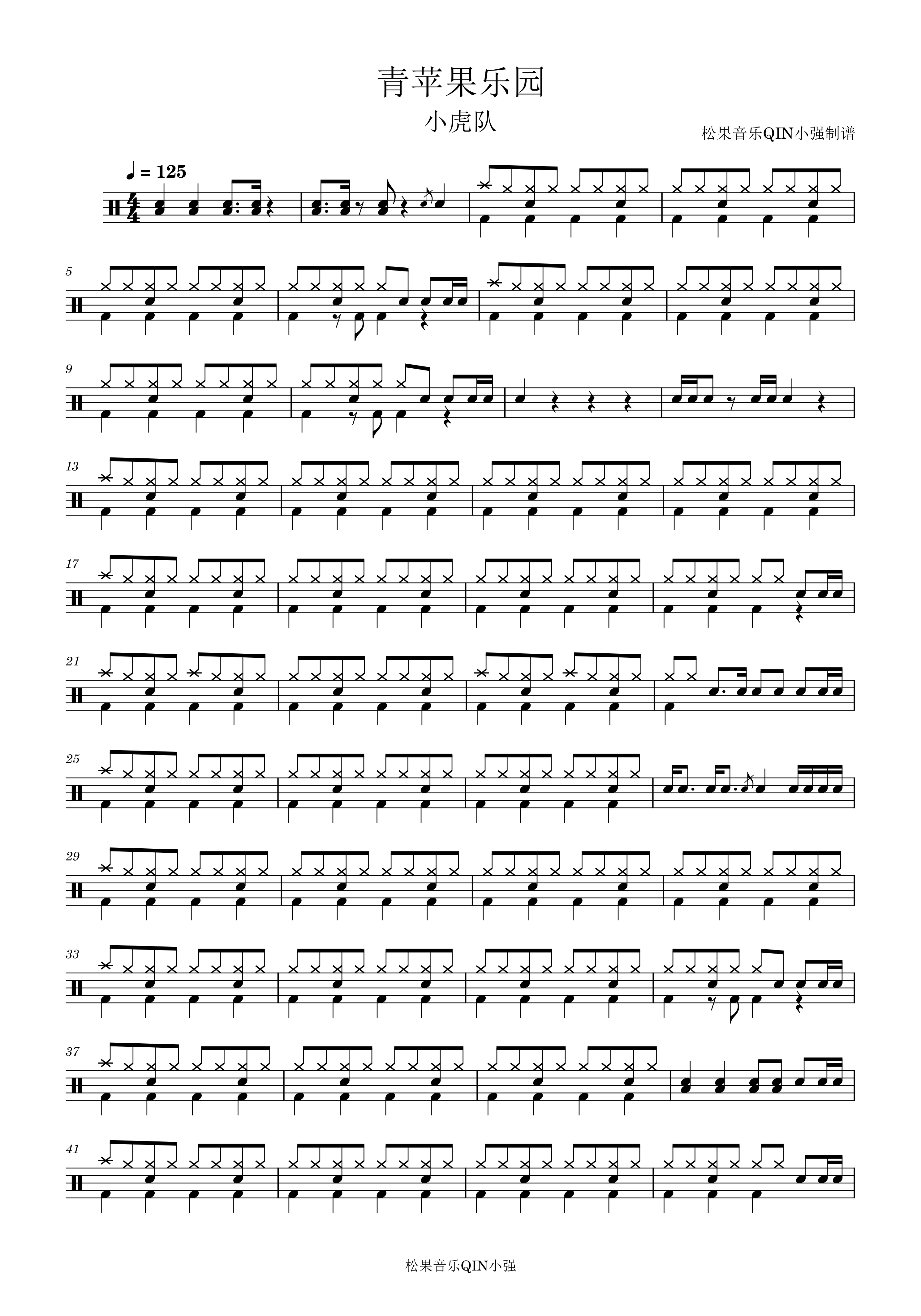 《青苹果乐园》是小虎队演唱的一首歌曲,拍号为4/4拍,这份架子鼓谱共有三张高清图谱,图谱由 @松果音乐QIN小强 编配上传,图谱使用五线谱编配,使用这份青苹果乐园架子鼓谱,你将能够轻松地敲打出这首小虎队的青苹果乐园,快来尝试吧。《青苹果乐园》是中国台湾演唱团体小虎队演唱的一首歌曲,由丁晓雯填词,马饲野康二作曲,马饲野康二和陈志远编曲。发行于1989年1月24日,收录于与忧欢派对的合辑《新年快乐》中,是小虎队出道的第一首单曲。