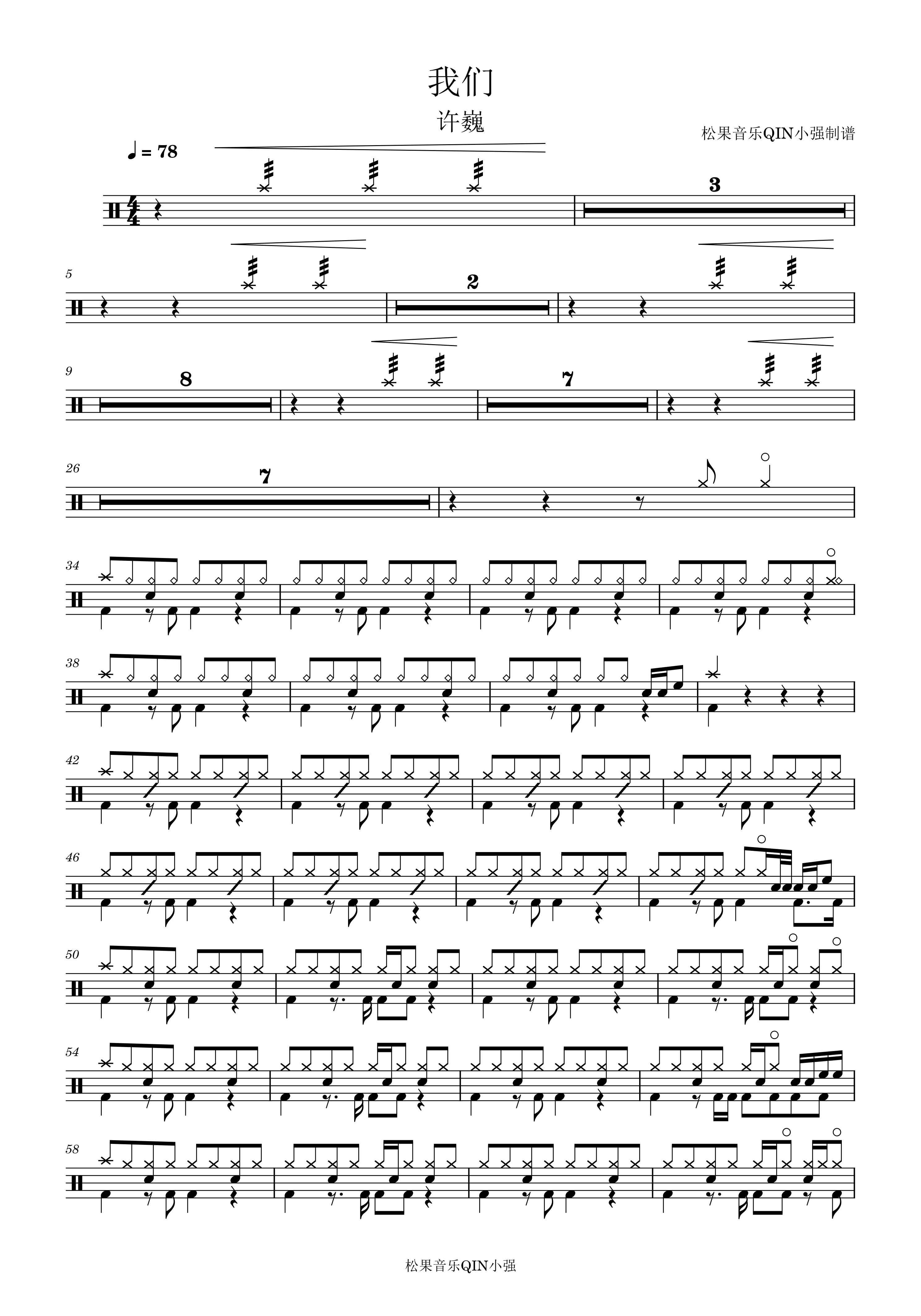 《我们》是许巍演唱的一首歌曲,拍号为4/4拍,这份架子鼓谱共有两张高清图谱,图谱由 @松果音乐QIN小强 编配上传,图谱使用五线谱编配,使用这份我们架子鼓谱,你将能够轻松地敲打出这首许巍的我们,快来尝试吧。《我们》是由许巍作词作曲并演唱的一首歌曲,该曲收录在许巍2008年发行的专辑《爱如少年》中。
