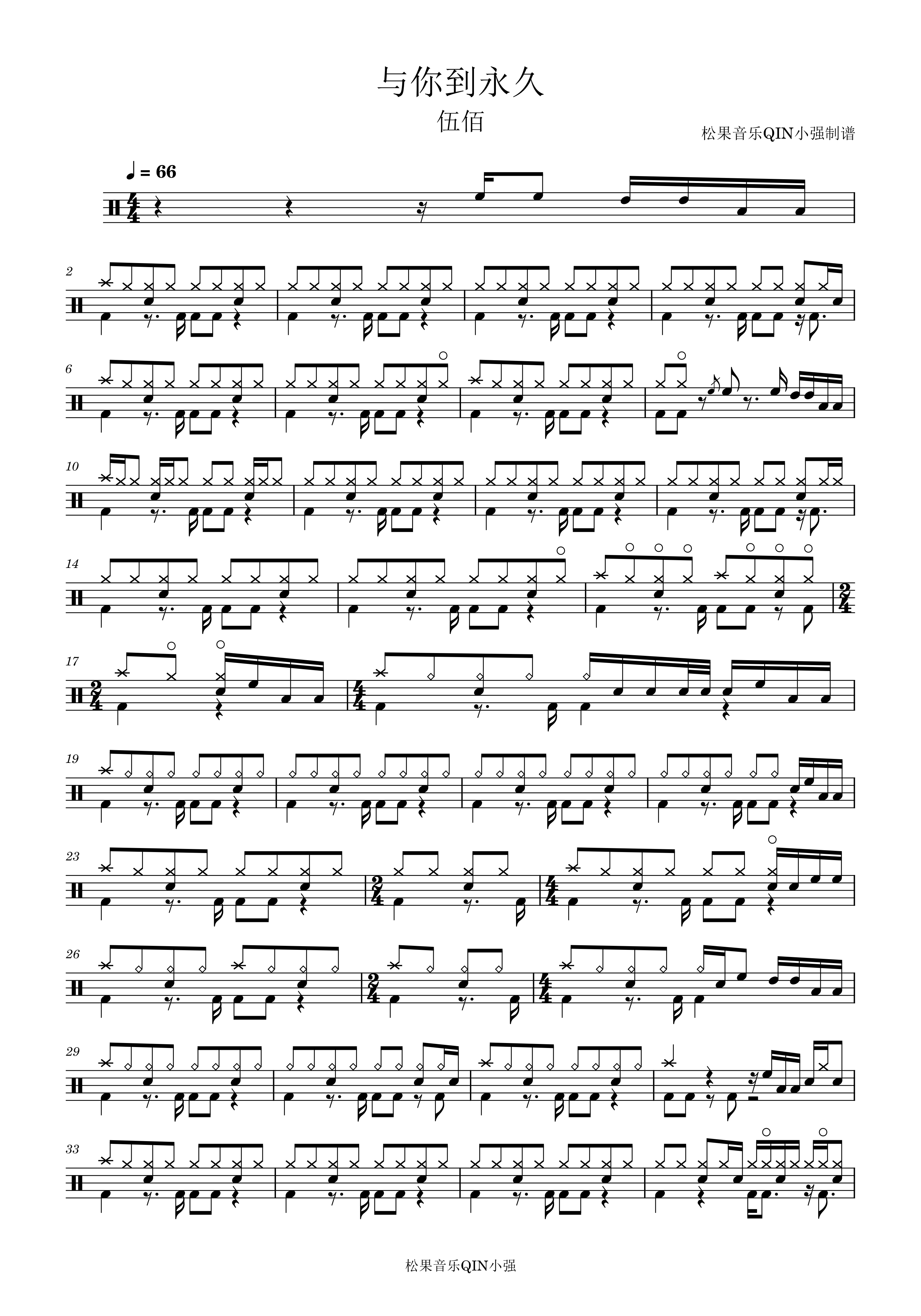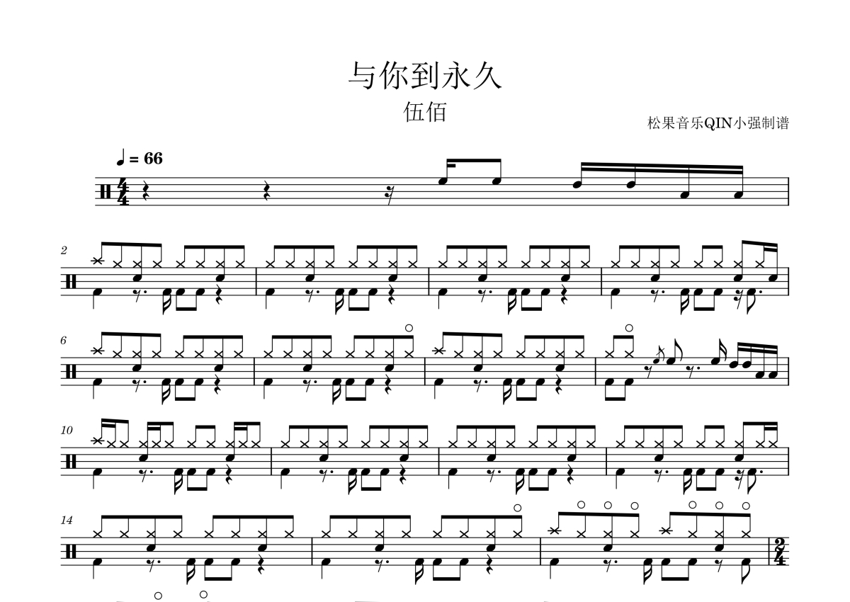 《与你到永久》是伍佰演唱的一首歌曲,拍号为4/4拍,这份架子鼓谱共有两张高清图谱,图谱由 @松果音乐QIN小强 编配上传,图谱使用五线谱编配,使用这份与你到永久架子鼓谱,你将能够轻松地敲打出这首伍佰的与你到永久,快来尝试吧。《与你到永久》是由伍佰创作并演唱的歌曲,收录于其1999年11月4日发行的专辑《白鸽》中。