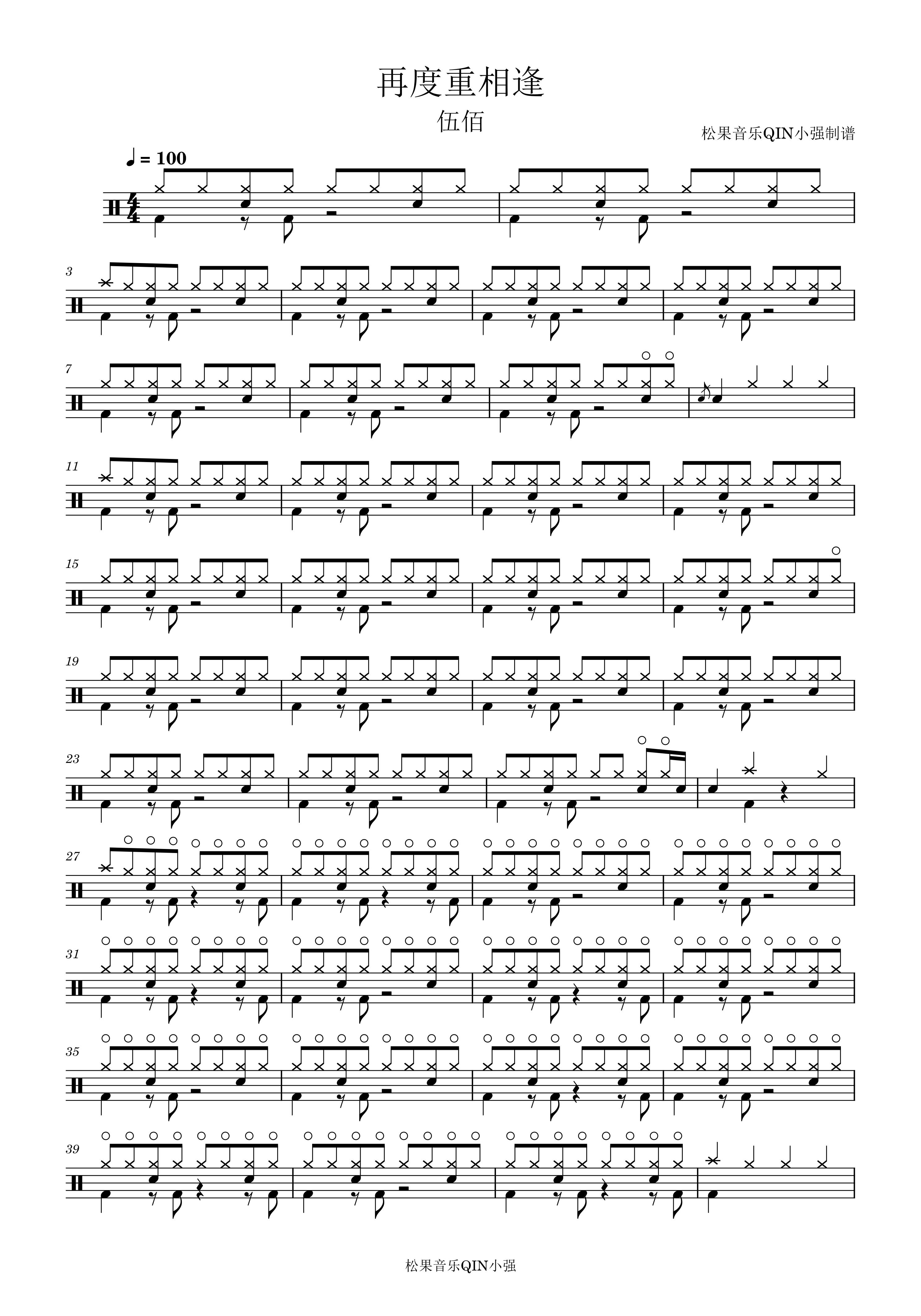 《再度重相逢》是伍佰演唱的一首歌曲,这份架子鼓谱共有两张高清图谱,图谱由 @松果音乐QIN小强 编配上传,图谱使用五线谱编配,使用这份再度重相逢架子鼓谱,你将能够轻松地敲打出这首伍佰的再度重相逢,快来尝试吧。《再度重相逢》是伍佰演唱的流行歌曲,由伍佰创作词曲,伍佰 & China Blue编曲,收录于伍佰的录音室专辑《泪桥》中,2003年12月5日随专辑通过月光音乐、爱贝克思发行。