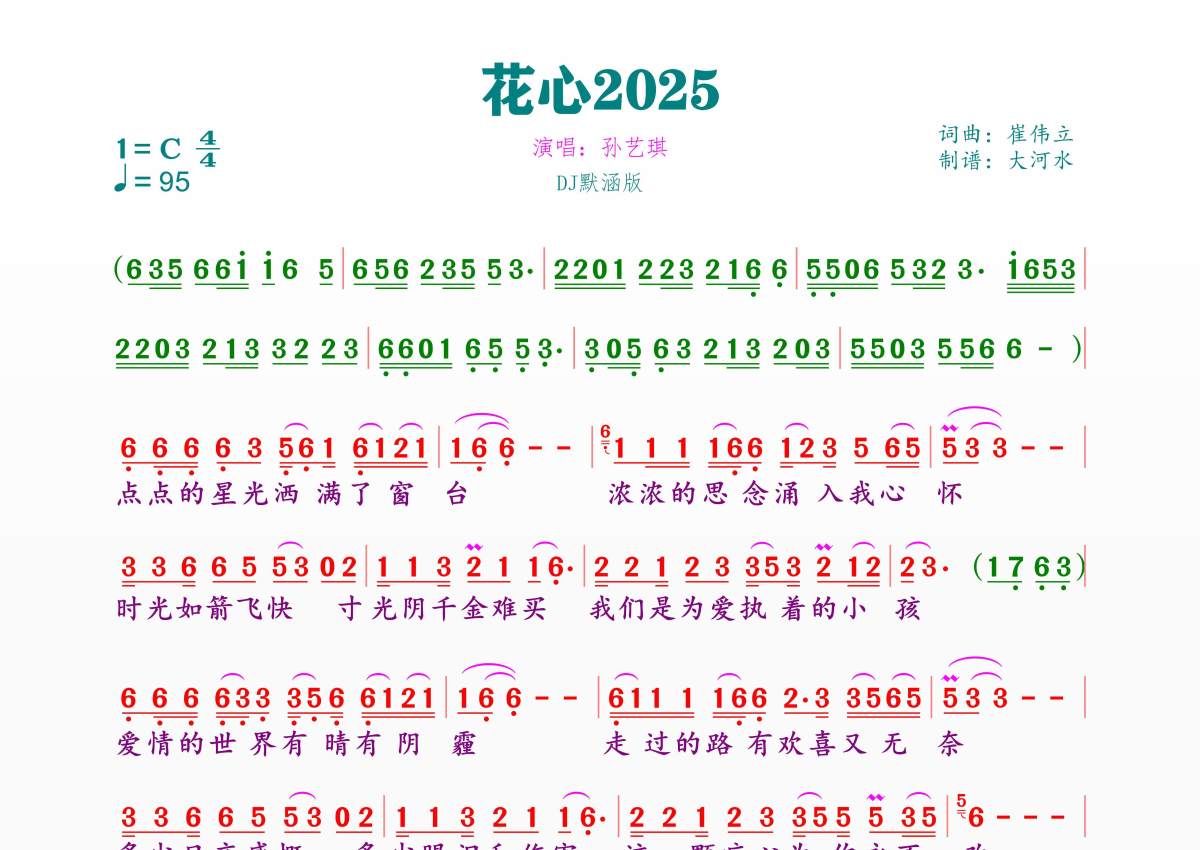 《花心2025》是孙艺琪演唱的一首歌曲,拍号为4/4拍,歌曲速度为每分钟95拍,这份简谱共有一张高清图谱,图谱由 @临海雪原 编配上传。