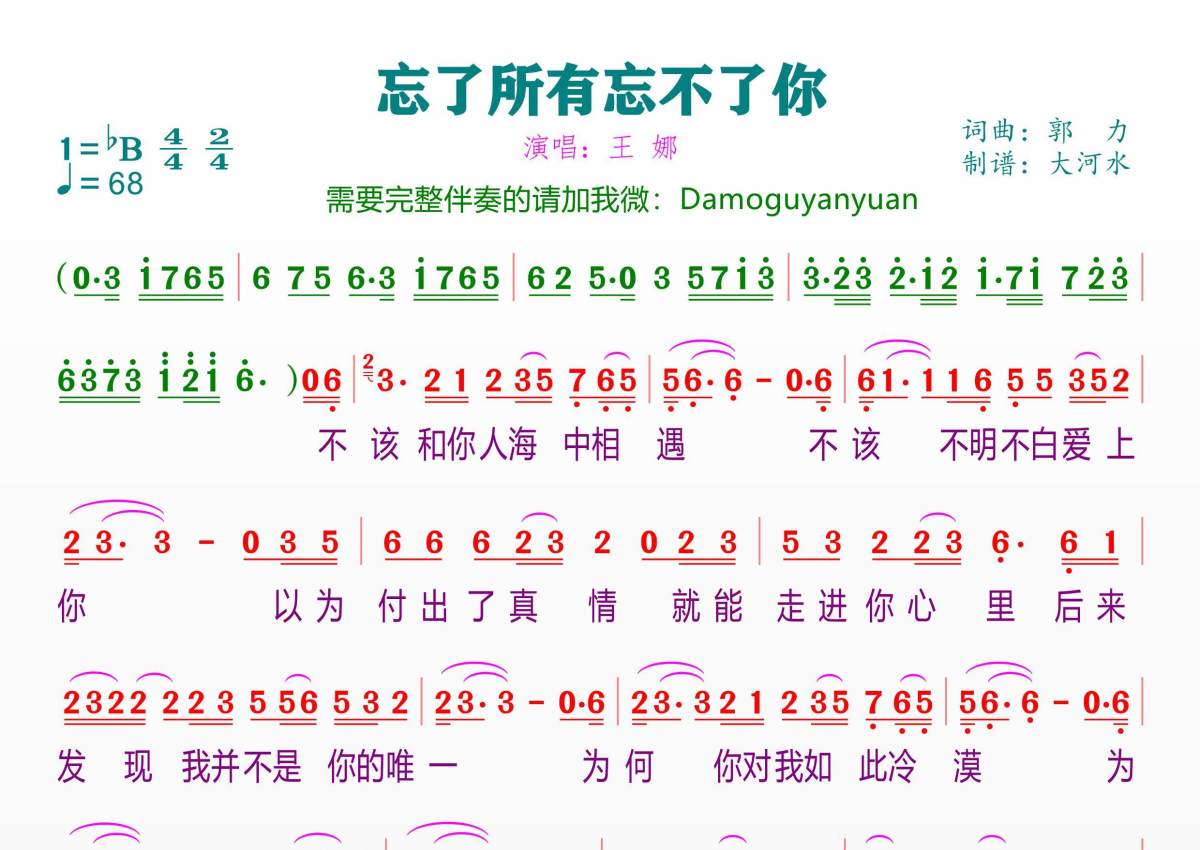 《忘了所有忘不了你》是王娜演唱的一首歌曲,拍号为4/4拍,歌曲速度为每分钟68拍,这份简谱共有一张高清图谱,图谱由 @临海雪原 编配上传。
