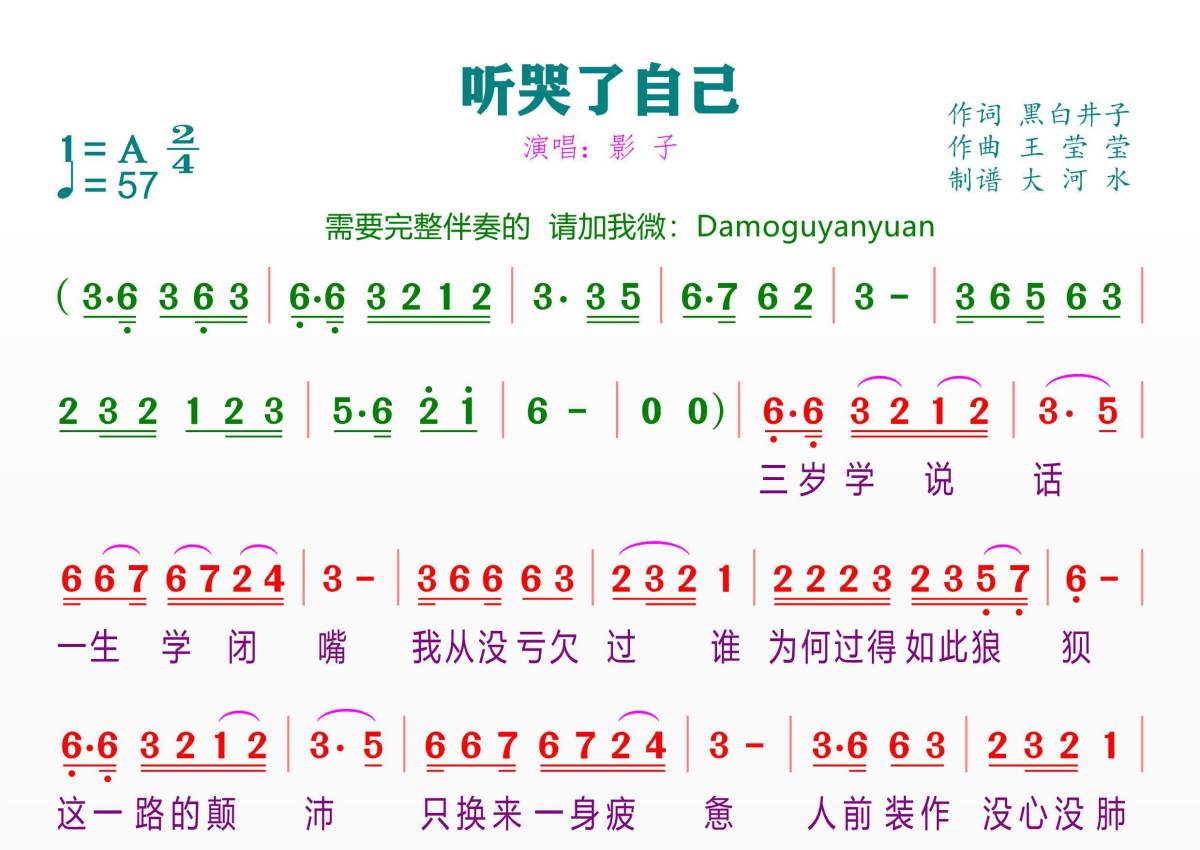 《听哭了自己》是影子演唱的一首歌曲,拍号为2/4拍,歌曲速度为每分钟57拍,这份简谱共有一张高清图谱,图谱由 @临海雪原 编配上传。