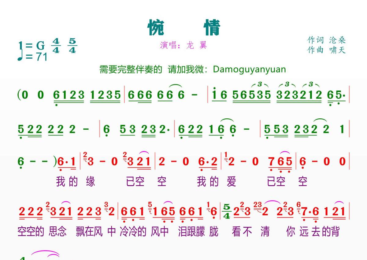 惋情简谱 - 龙翼演唱
