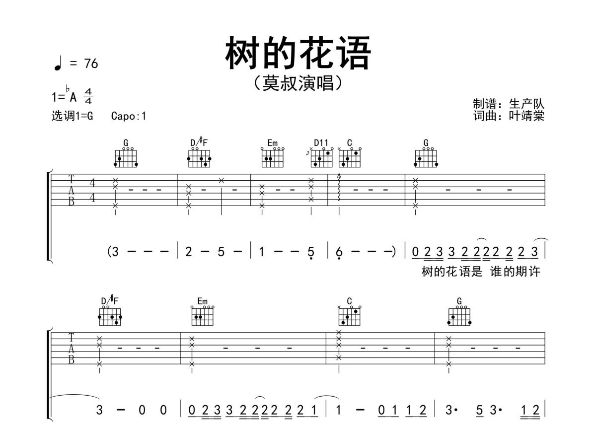 《树的花语》是莫叔演唱的一首歌曲,精编完美版,拍号为4/4拍,歌曲速度为每分钟76拍,歌曲原调为Ab调,但由于原调指法比较难,为了方便弹奏,本吉他谱采用的是G调指法编配,变调夹1品弹奏即为原调,当然也可以根据自己的音域改变变调夹位置,或者通过改变和弦调性,以方便自己弹奏,这份吉他谱共有三张高清图谱,图谱由 @生产队 编配上传,图谱使用六线谱编配,包含吉他和弦指法、简谱以及歌词部分,使用这份树的花语吉他谱,可以让你更加方便地掌握这首歌曲的弹唱技巧,快来尝试吧。莫叔演唱的歌曲《树的花语》原版吉他谱,含前奏、间奏solo编配,精编完美版,优质推荐!。
