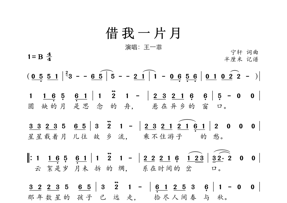 《借我一片月》是王一菲演唱的一首歌曲,拍号为4/4拍,这份简谱共有一张高清图谱,图谱由 @海 编配上传。