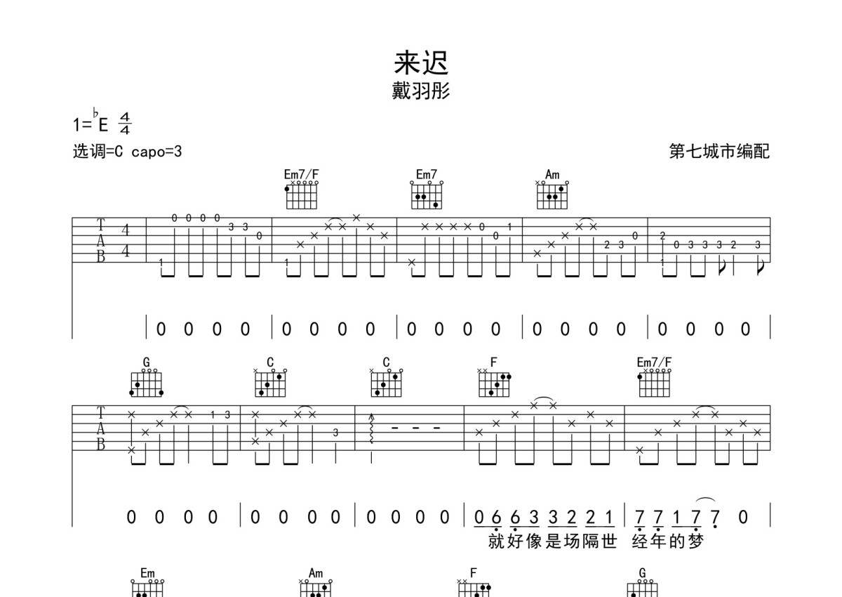 《来迟》是戴羽彤演唱的一首歌曲,本吉他谱采用的是C调指法编配,这份吉他谱共有三张高清图谱,图谱由 @第七城市 编配上传,图谱使用六线谱编配,包含吉他和弦指法、简谱以及歌词部分,使用这份来迟吉他谱,可以让你更加方便地掌握这首歌曲的弹唱技巧,快来尝试吧。本曲谱由第七城市编配制作。
