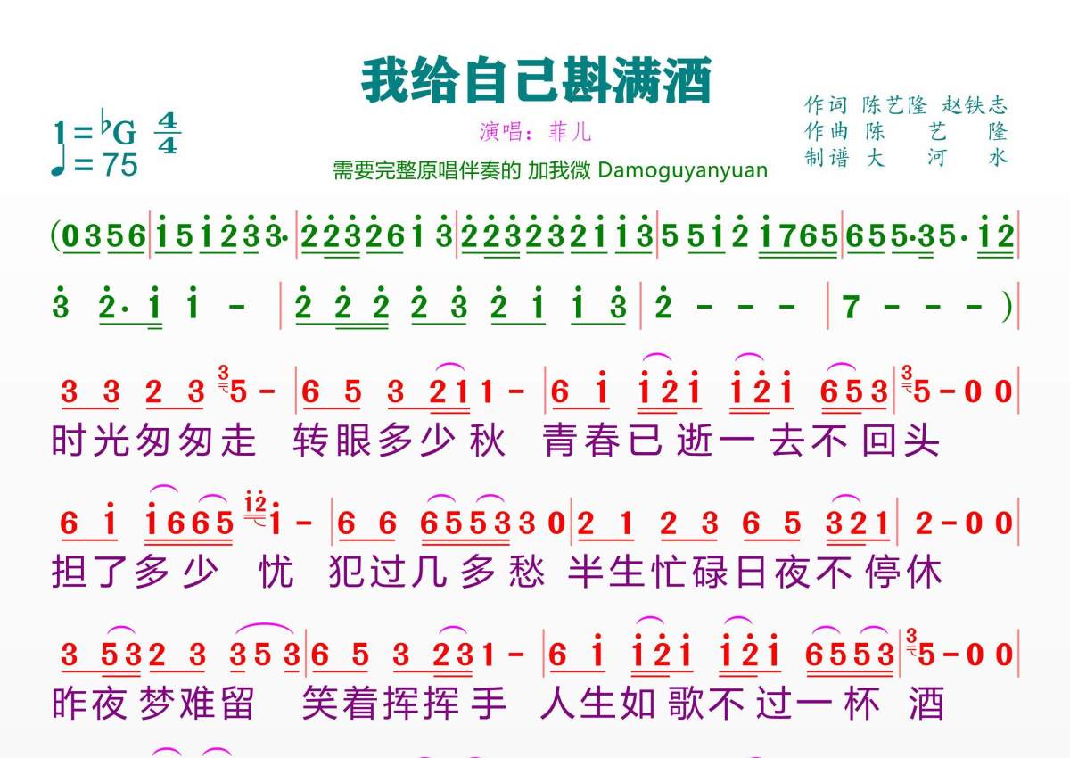 《我给自己斟满酒》是菲儿演唱的一首歌曲,拍号为4/4拍,歌曲速度为每分钟75拍,这份简谱共有一张高清图谱,图谱由 @临海雪原 编配上传。