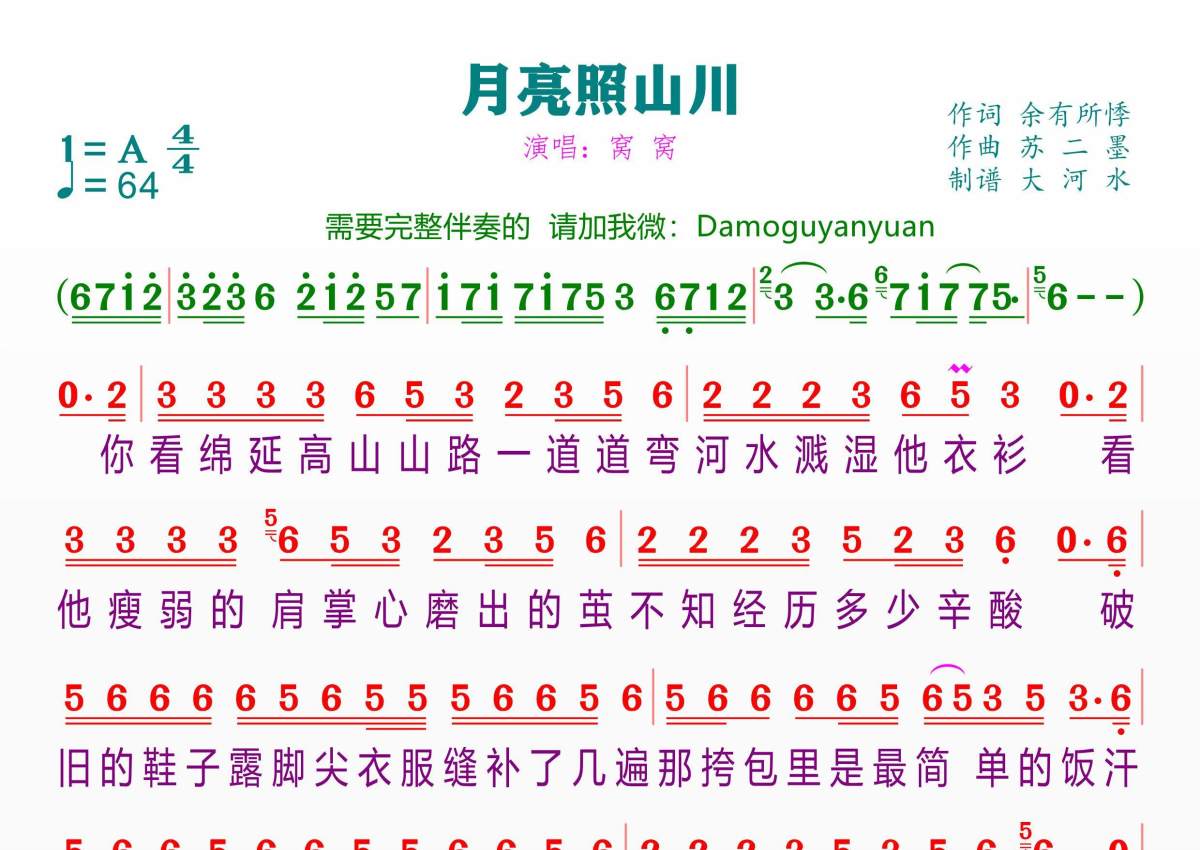 《月亮照山川》是窝窝演唱的一首歌曲,这份简谱共有一张高清图谱,图谱由 @临海雪原 编配上传。