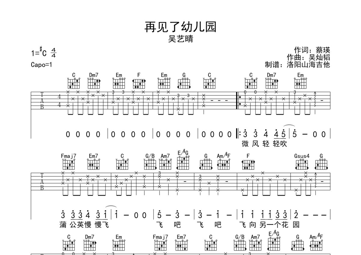 吴艺晴《再见了幼儿园》吉他谱 - C调弹唱六线谱