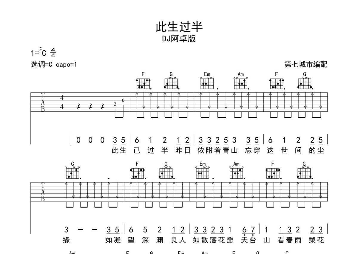DJ阿卓版《此生过半》吉他谱 - C调弹唱六线谱