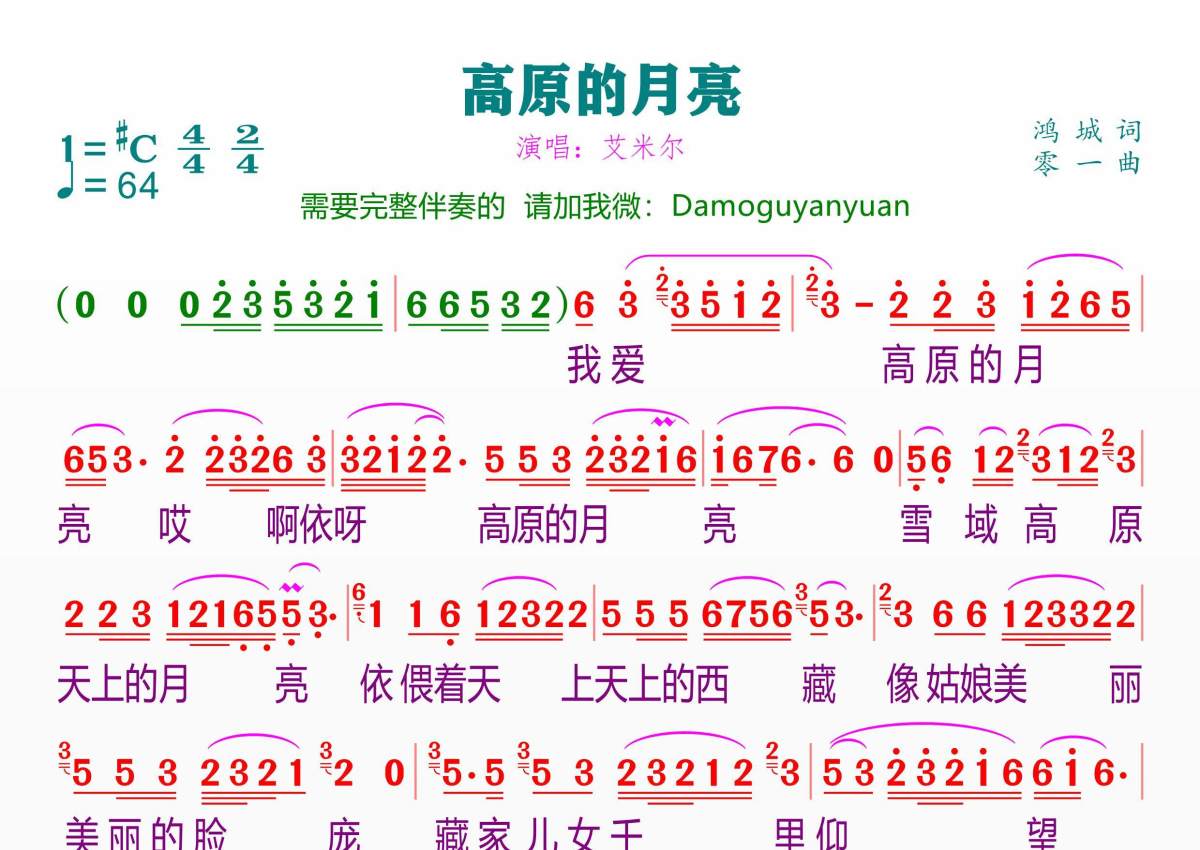 《高原的月亮》是艾米尔演唱的一首歌曲,拍号为4/4拍,歌曲速度为每分钟64拍,这份简谱共有一张高清图谱,图谱由 @临海雪原 编配上传。