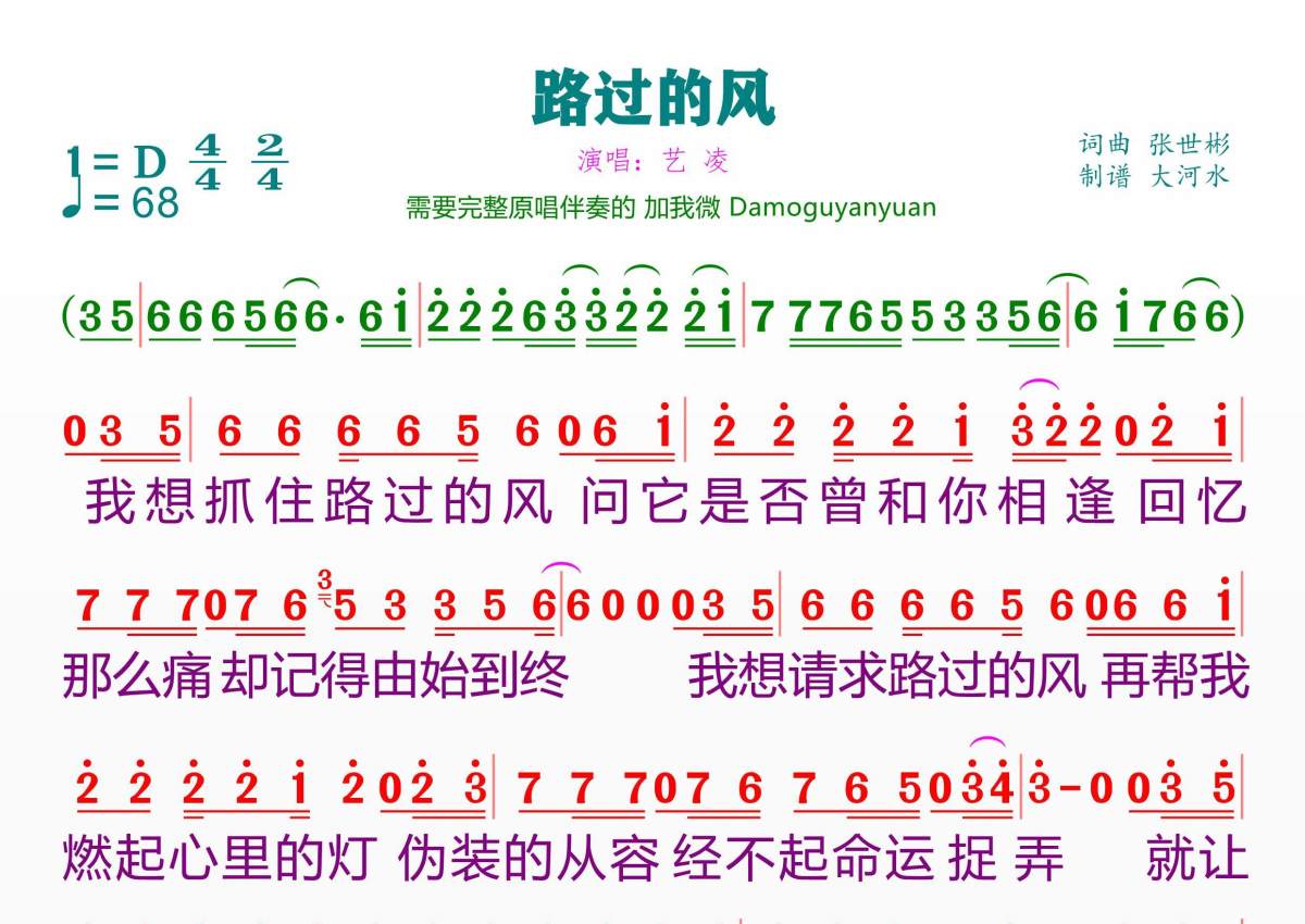 《路过的风》是艺凌演唱的一首歌曲,拍号为4/4拍,歌曲速度为每分钟68拍,这份简谱共有一张高清图谱,图谱由 @临海雪原 编配上传。
