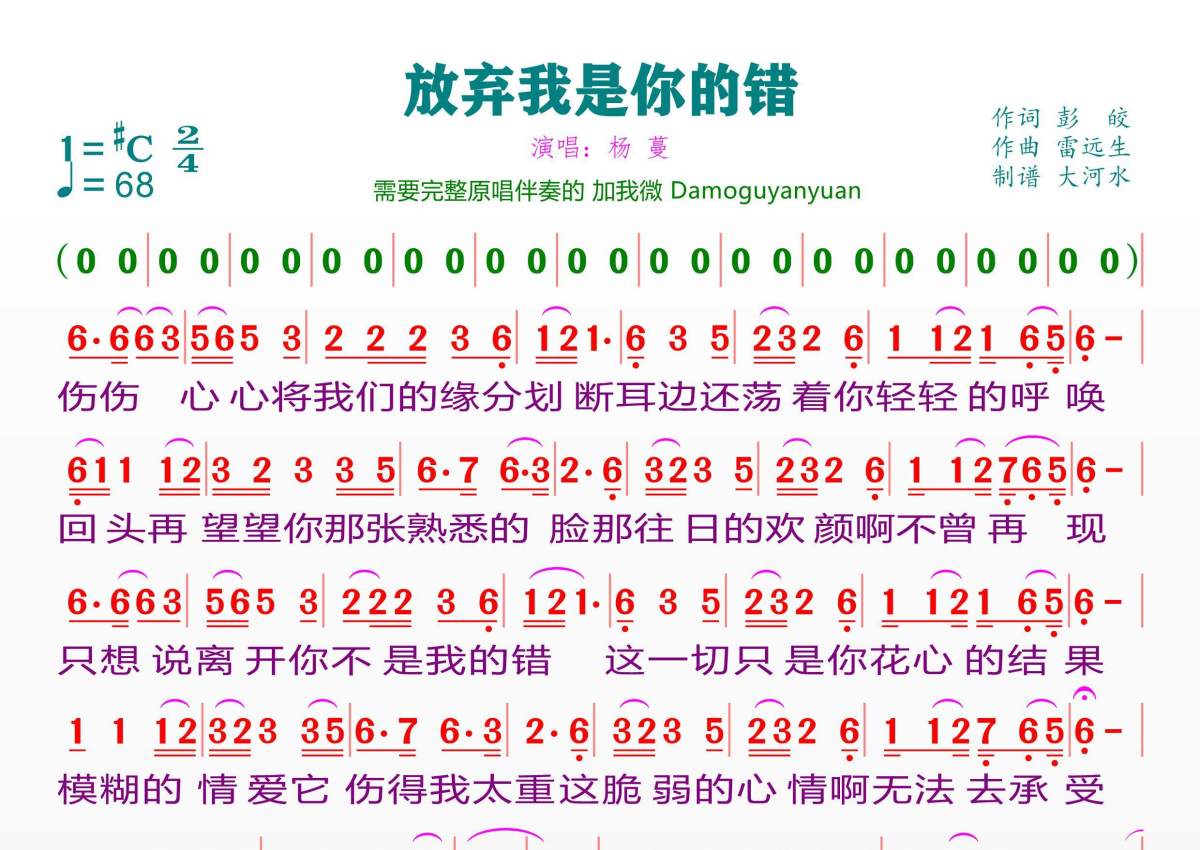 《放弃我是你的错》是杨蔓演唱的一首歌曲,拍号为2/4拍,歌曲速度为每分钟68拍,这份简谱共有一张高清图谱,图谱由 @临海雪原 编配上传。