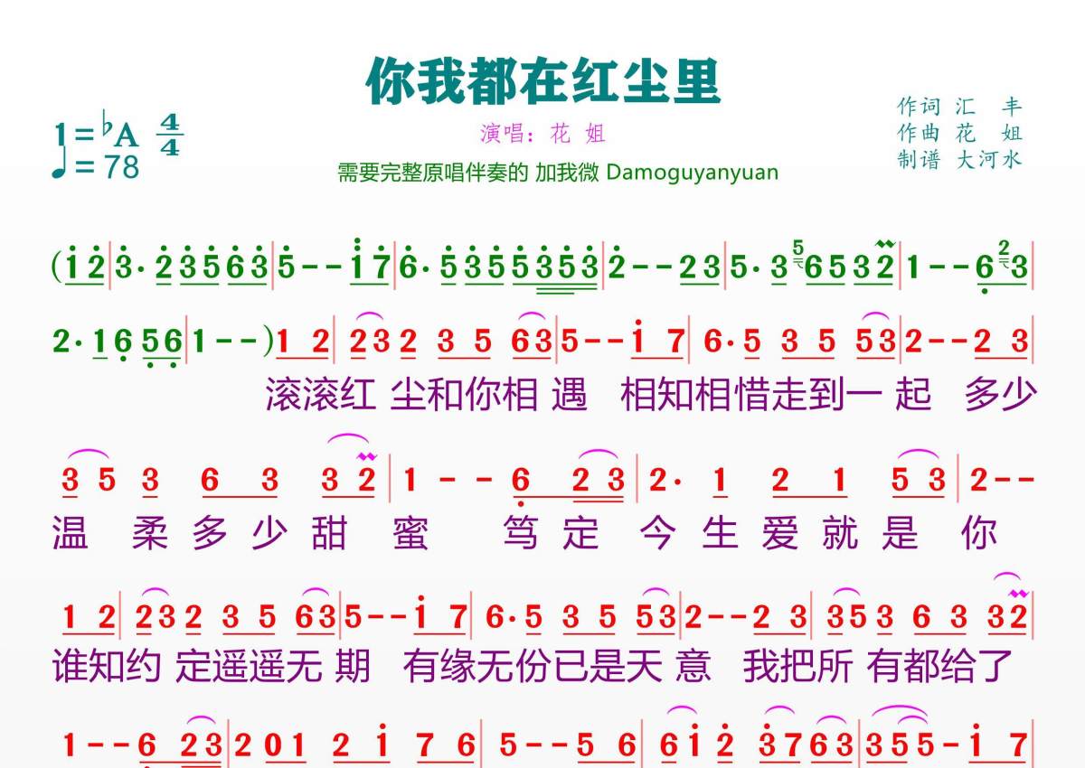 《你我都在红尘里》是花姐演唱的一首歌曲,拍号为4/4拍,歌曲速度为每分钟78拍,这份简谱共有一张高清图谱,图谱由 @临海雪原 编配上传。