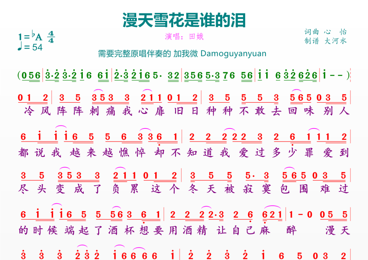 《漫天雪花是谁的泪》是田娥演唱的一首歌曲,拍号为4/4拍,歌曲速度为每分钟54拍,这份简谱共有一张高清图谱,图谱由 @临海雪原 编配上传。