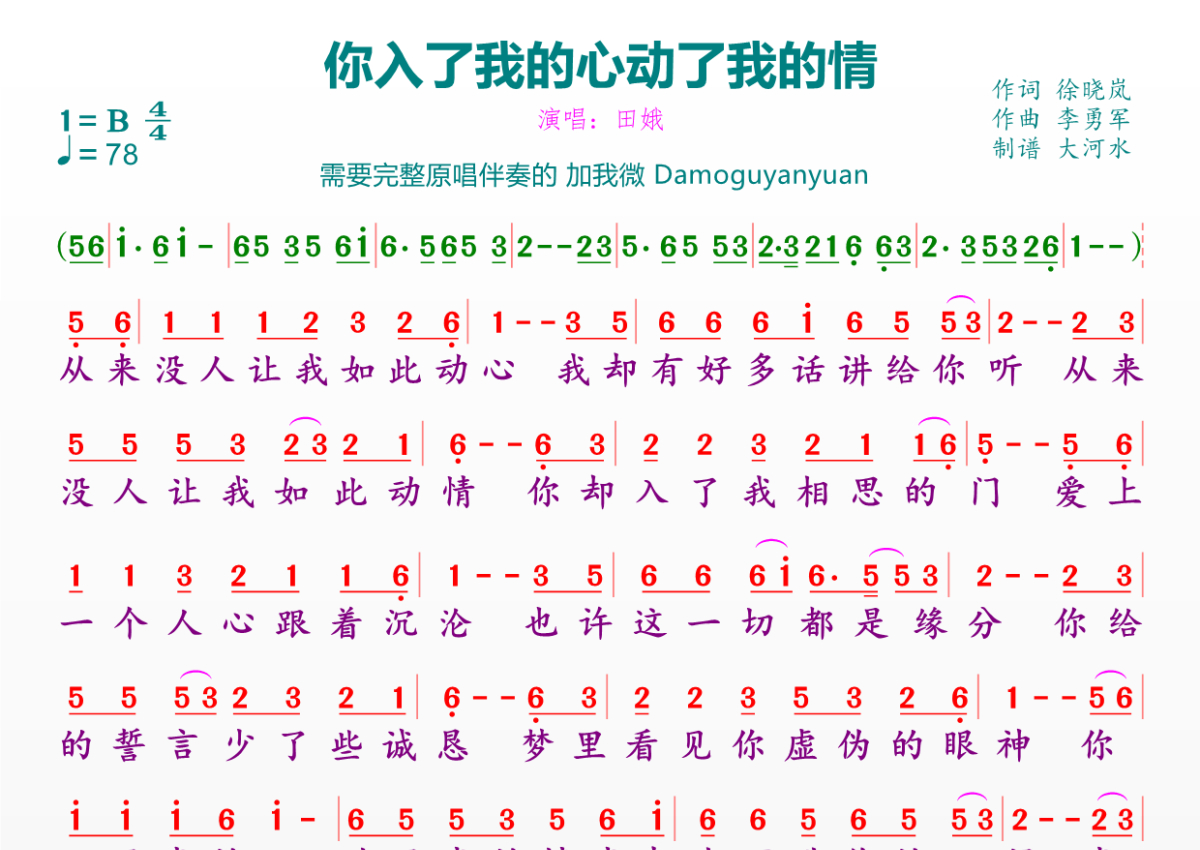 《你入了我的心动了我的情》是田娥演唱的一首歌曲,拍号为4/4拍,歌曲速度为每分钟78拍,这份简谱共有一张高清图谱,图谱由 @临海雪原 编配上传。