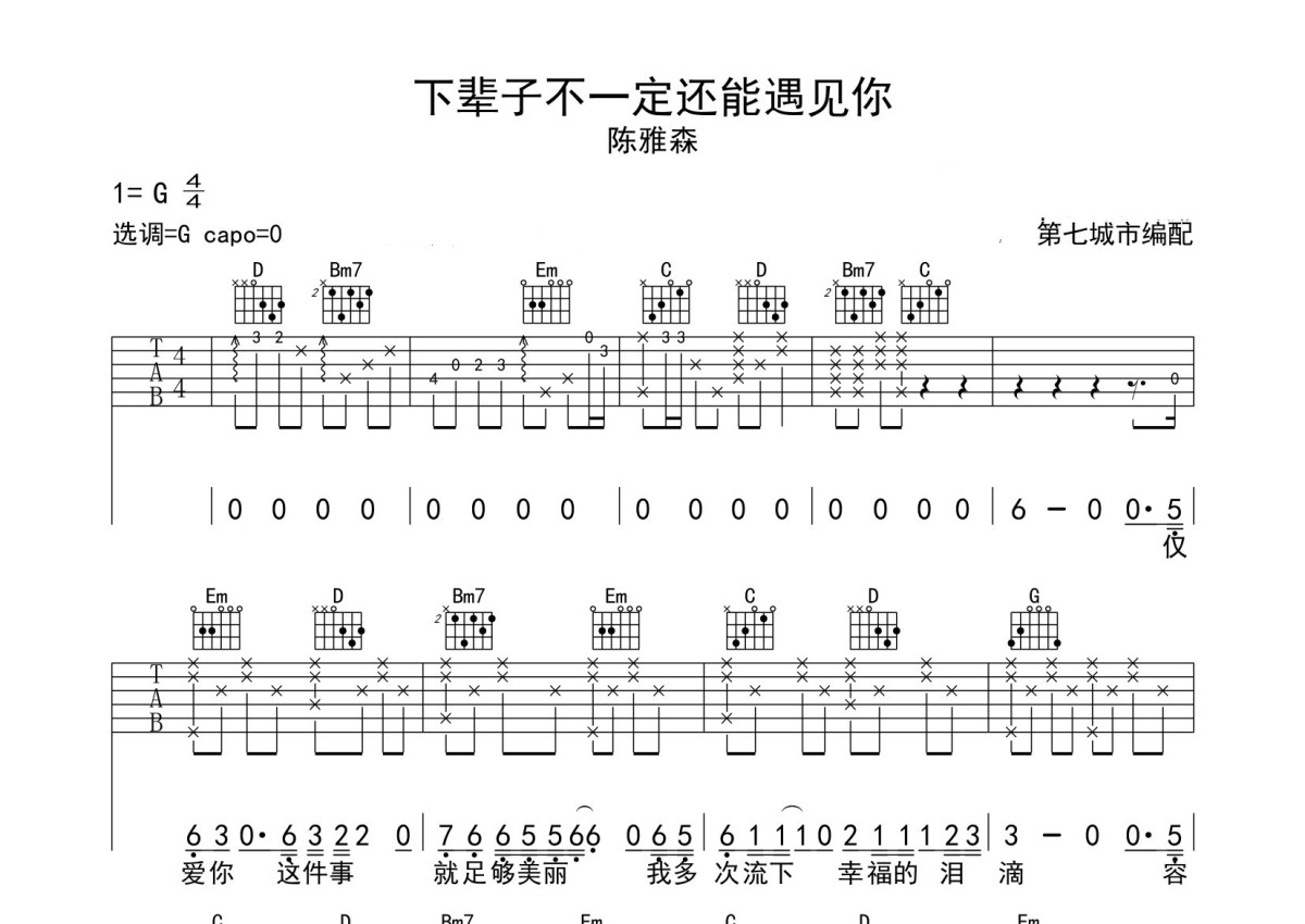 陈雅森《下辈子不一定还能遇见你》吉他谱 - G调弹唱六线谱