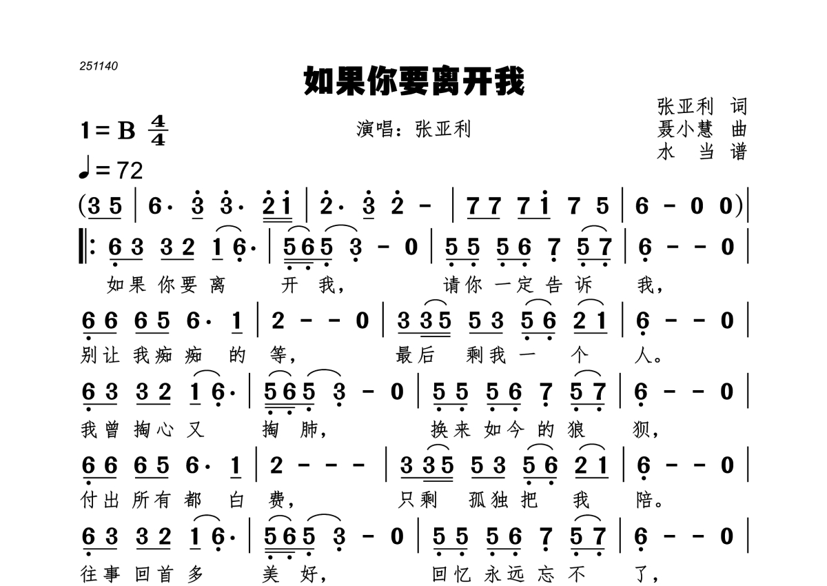 《如果你要离开我》是张亚利演唱的一首歌曲,拍号为4/4拍,歌曲速度为每分钟72拍,这份简谱共有一张高清图谱,图谱由 @水当 编配上传。