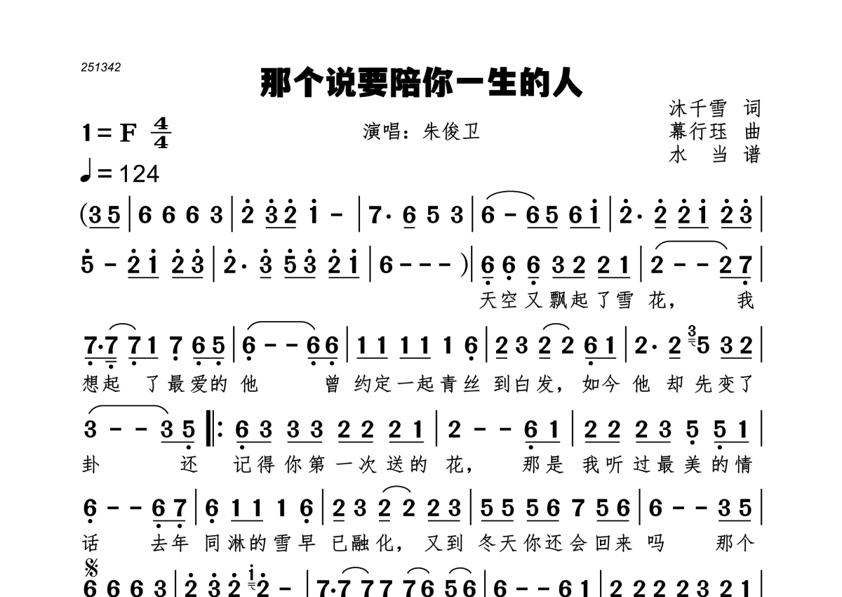 《那个说要陪你一生的人》是朱俊卫演唱的一首歌曲,拍号为4/4拍,歌曲速度为每分钟124拍,这份简谱共有一张高清图谱,图谱由 @水当 编配上传。
