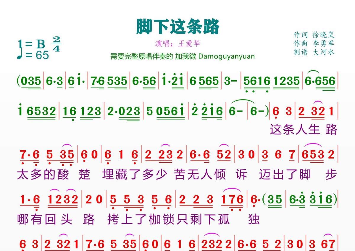 《脚下这条路》是王爱华演唱的一首歌曲,拍号为2/4拍,歌曲速度为每分钟65拍,这份简谱共有一张高清图谱,图谱由 @临海雪原 编配上传。