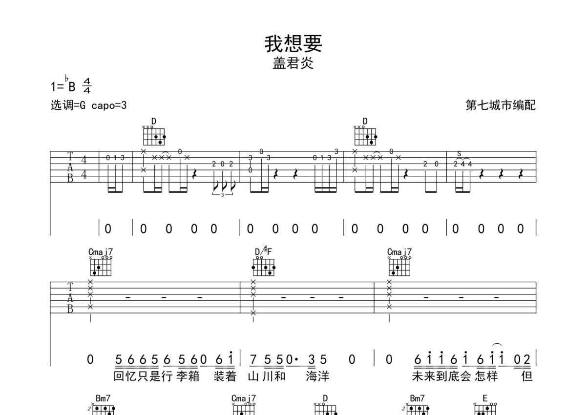 《我想要》是盖君炎演唱的一首歌曲,本吉他谱采用的是G调指法编配,这份吉他谱共有三张高清图谱,图谱由 @第七城市 编配上传,图谱使用六线谱编配,包含吉他和弦指法、简谱以及歌词部分,使用这份我想要吉他谱,可以让你更加方便地掌握这首歌曲的弹唱技巧,快来尝试吧。盖君炎《我想要》吉他谱_G调吉他弹唱谱。