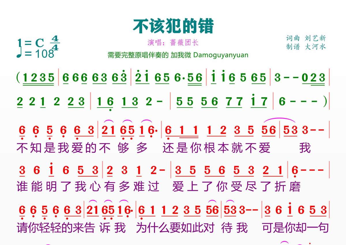 《不该犯的错》是蔷薇团长演唱的一首歌曲,拍号为4/4拍,歌曲速度为每分钟108拍,这份简谱共有一张高清图谱,图谱由 @临海雪原 编配上传。