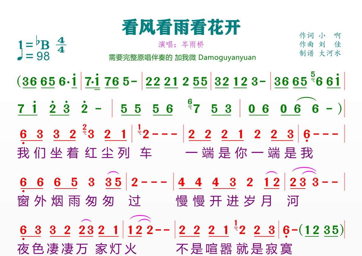 看风看雨看花开简谱 - 岑雨桥演唱