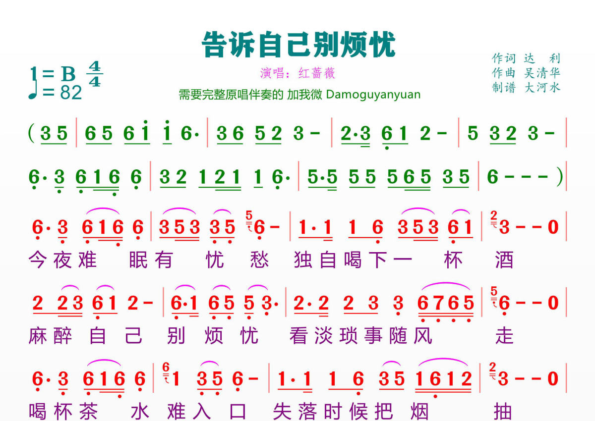 告诉自己别烦忧简谱 - 红蔷薇演唱