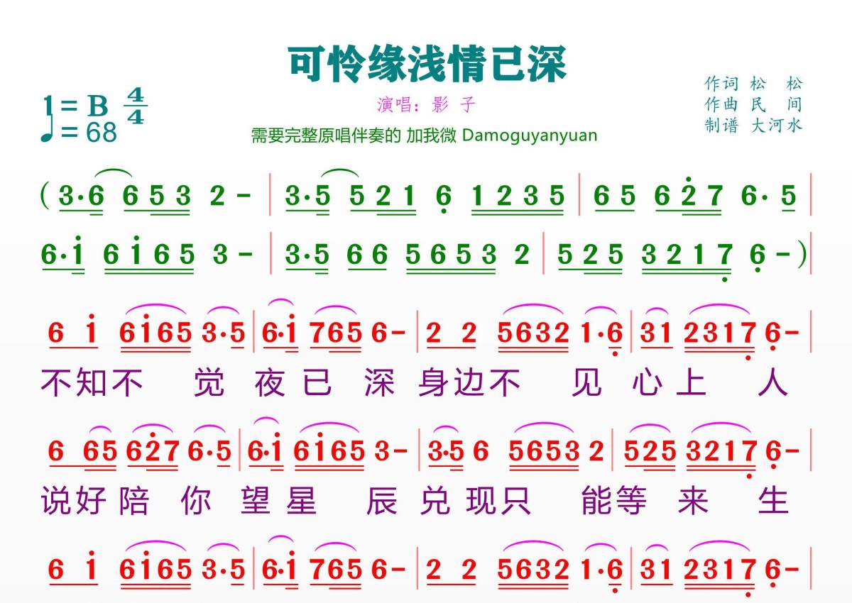 《可怜缘浅情已深》是影子演唱的一首歌曲,拍号为4/4拍,歌曲速度为每分钟68拍,这份简谱共有一张高清图谱,图谱由 @临海雪原 编配上传。