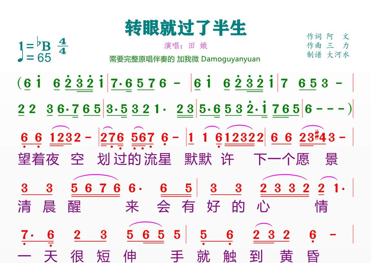 《转眼就过了半生》是田娥演唱的一首歌曲,拍号为4/4拍,歌曲速度为每分钟65拍,这份简谱共有一张高清图谱,图谱由 @临海雪原 编配上传。