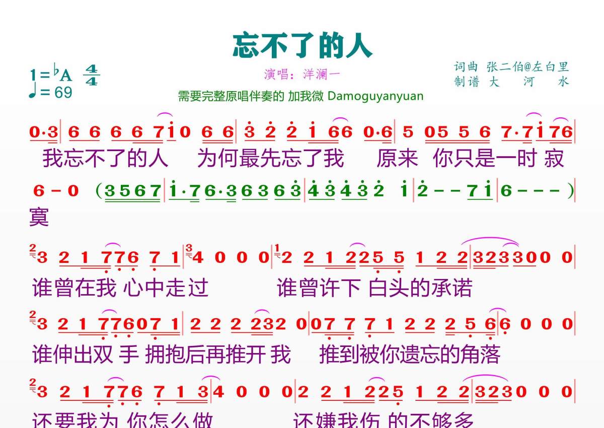 《忘不了的人》是洋澜一演唱的一首歌曲,拍号为4/4拍,歌曲速度为每分钟69拍,这份简谱共有一张高清图谱,图谱由 @临海雪原 编配上传。